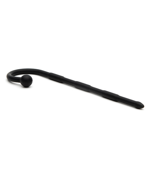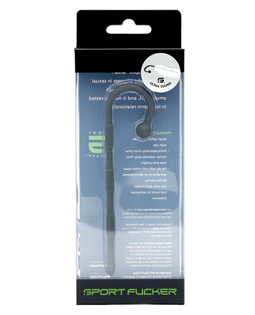 Looking to try to bust your final sex-cherry? Sounding is quickly becoming one of the fastest growing fetishes among men. You already spend half of your free time rubbin' and tuggin' on your best appendage. Why not stimulate it from the inside? Not into traditional medical play? No problem. With our 100% medical grade premium silicone sounds, your best man and its urethra will thank you! All the metal benefits of an ultra-smooth surface and ability to sterilize without the cold, non-bending attributes of a traditional metal sound. This great plug has three cylindrical ridges slightly raised wider than the shaft. What makes this plug unique is the curved handle that goes over the head of your cock and rests with its ball right on your frenulum glan. This is a great sensation of both internal and a slight external stimulation. Plus, it looks hot to see the handle sticking out, knowing your throbbing member is stuffed with the Ultra Sound. Be sure to only use these great toys with sterile lube. Material: Silicone Dimensions: Length: 12.7cm. (5 in.) Ball: 1cm. (4 in.) Shaft: 4.35mm.-4.6mm. (.17-.18 in.) Ridges: 5.1mm-5.2mm (.2-.21 in) Tip: 5.2mm. (.21 in) Distance from ball to shaft: 2.3 cm. (.9 in)