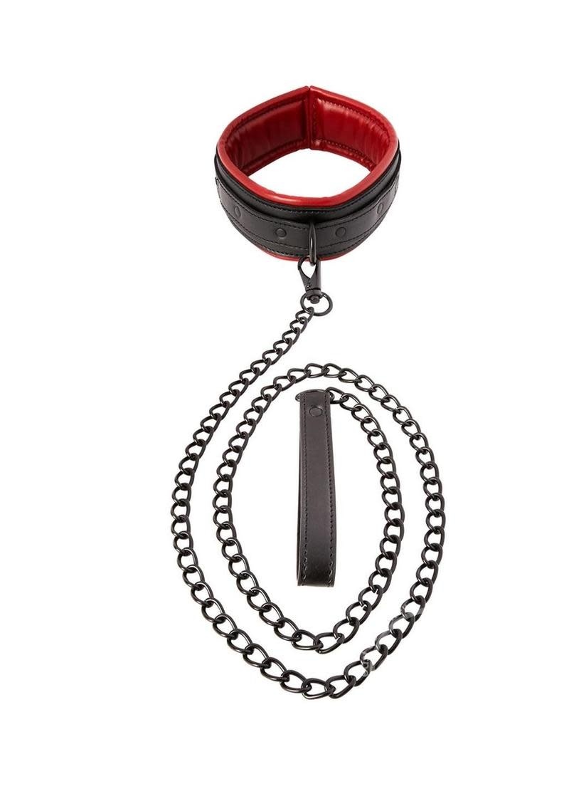 Silk sheets, rose petals, candles, and champagne... they've got a time and place. But sometimes the evening calls for something a little spicier. Made from vegan leather of the deepest midnight and the brightest scarlet, this collar and leash set looks and feels luxurious so that your power play is sophisticated and sexy. Wrap the collar around your plaything's delicate throat. The strap adjusts to fit a wide range of sizes. Attach the leash's long chain to the D-ring and get a firm grip on the loop handle. Now your partner is under your control. But why can't you have a little sugar with your spice? Don't ditch the silk and champagne yet...