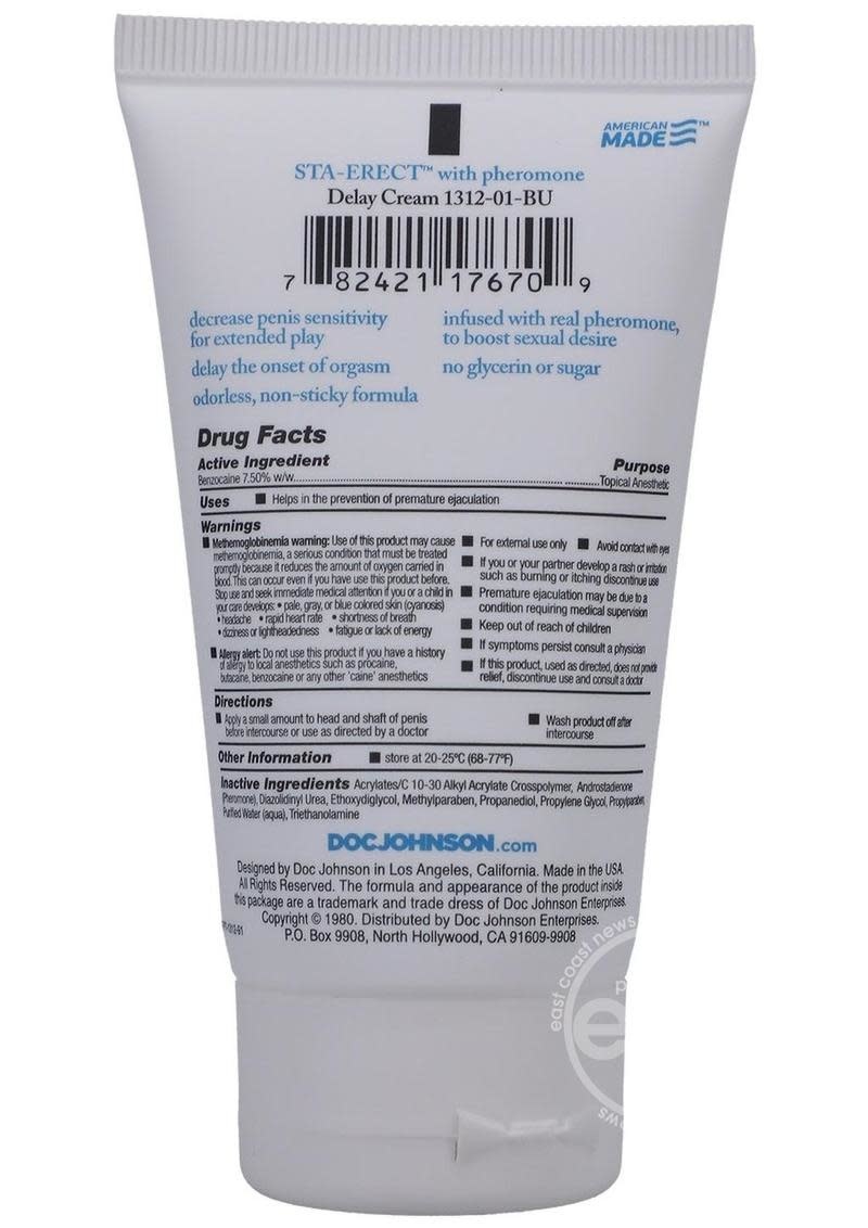Get more banging for your buck with Doc Johnson's Sta-Erect cream. Contains 7.5% Benzocaine which acts as a desensitizing agent to help the man delay or prevent premature ejaculation. Odorless and tasteless. 2 oz.