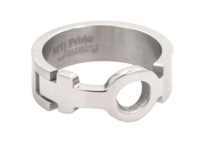 Innovative new design features the female Venus sign integrated into the band of the ring in a puzzle design. The entire piece is crafted in 316L stainless steel. The band is finished in brushed steel and the sign itself is finished in polished steel.