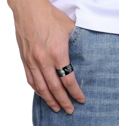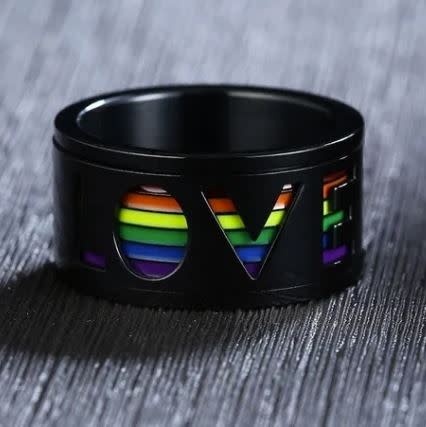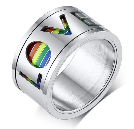 STAINLESS 'LOVE' CUT OUT WITH RAINBOW STRIPE RING