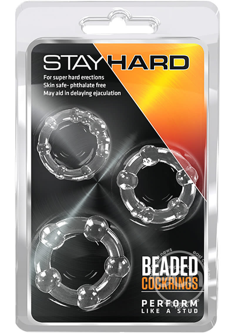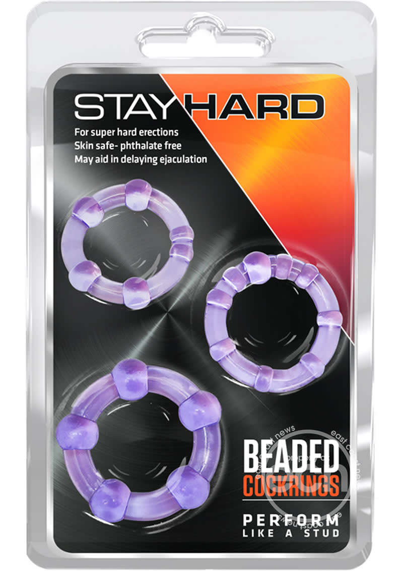 Perform like the stud you are! These Stay Hard Beaded Cock Rings come in 3 sizes, so you can use them individually or all 3 at once. The Small Ring is for maximum erections; Medium Ring is for hard erections; Large Ring can be used to encircle the upper part of your scrotum to help prevent premature ejaculation. They are made of body safe TPE, a super stretchy, comfortable and Phthalate Free material developed specifically for your safety and hygiene during your intimate play. So, if you're looking for a safe way to increase both in size and stamina, you and your partner are sure to enjoy Blush Novelties Stay Hard Beaded Cock Ring and your bigger, better erection that lasts even longer! Wash with soap and water between uses. Air dry. Stores best in the original packaging