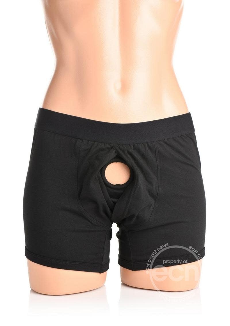 Wear your boxers under your garment and always feel confident, comfortable, and ready for a good time! With a hidden O-ring sewn into the cotton and spandex blend shorts, the front of your boxers look just like any other! When you're ready, slip the strapon dildo of your choice into place! Until then, enjoy the comfortable and breathable fabric as you wear it beneath your clothes! The wide, supportive elastic band helps support the weight of your strapon dildo and keeps the boxers from sagging. As an added bonus, care for your new harness is easy! Simply machine wash your boxers after each use on a cold cycle. To preserve the life and elasticity of the fabric, hand-wash and air-dry to avoid exposure to heat.