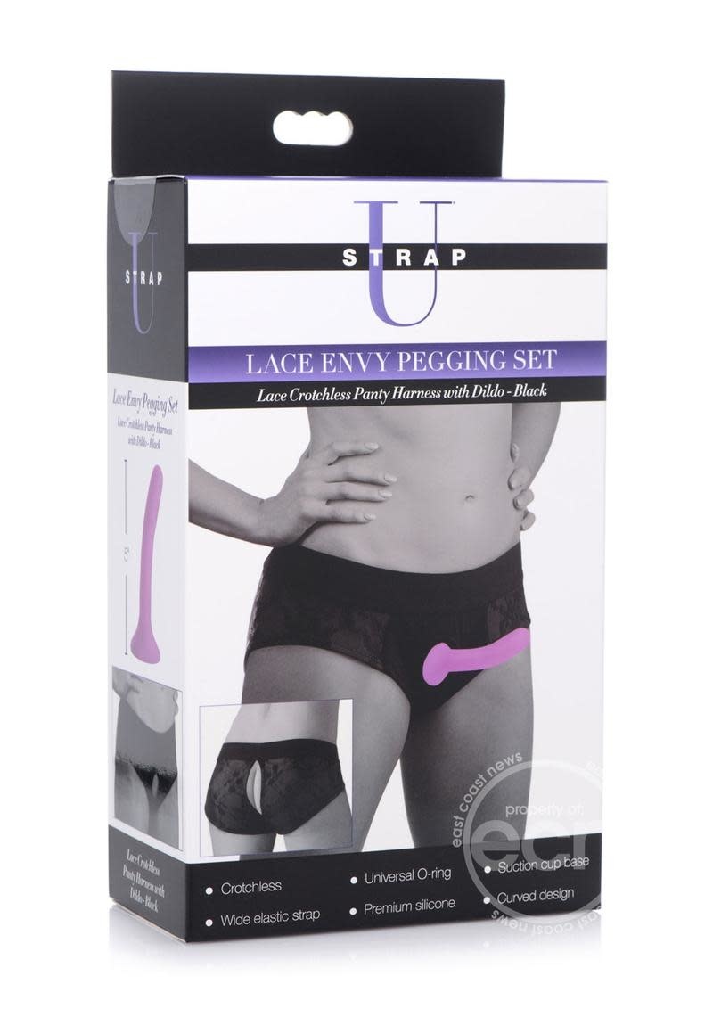 This lacey harness is crafted for functionality and comfort! The crotchless design keeps you ready for action when the mood to switch positions arises, allowing you and your lover to play with absolute freedom. The lingerie styling and universal O-ring let you get your strap-on in style! This solid black Lace Envy is fit for Large to Extra Large sizes - the wide elastic strap better secures your dildo in comfort! The wide surface area spreads the weight of your thrusts and dong evenly across the waist, preventing discomfort and soreness. Wear for extended sessions without worry of the harness slipping or irritating your skin! The built in Universal O-ring has an inner diameter of 1.5 inches, capable of fitting a variety of dildo sizes so you can change your weapon of choice depending on the mood of your and your partner. Made with machine washable material for easy cleaning before or after use. The included suction cup dildo fits perfectly in the Lace Envy, and is made with premium phthalate free silicone for a body safe feel. This dildo is slightly curved for you and your lover to easily target sensitive spots like the G-spot and prostate and velvety smooth for premium pleasure.