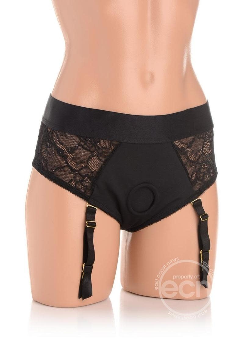 Wear these sexy undies and surprise your partner with a harness that includes both form and function! The stretchy spandex and nylon panties have a beautiful lace design that accentuates your curves and hips while still offering support for a strapon dildo. The wide strap at the hips supports the lower back and helps hold up the weight of the dildo. You can enjoy giving and receiving with this crotchless set that also includes a slit in the back for access to your derriere! At the front is an O-ring that fits most dildos and another layer right behind it to reduce chafing that the dildo base sits against. The opening to the O-ring has a 1.75 inch diameter. Enjoy wearing stockings? The garter belt straps help keep up a cute pair of stockings for those who enjoy wearing them! To clean after use, you can wash it in the machine on cold, but to keep the elasticity for longer make sure to hand wash in cold and air dry.