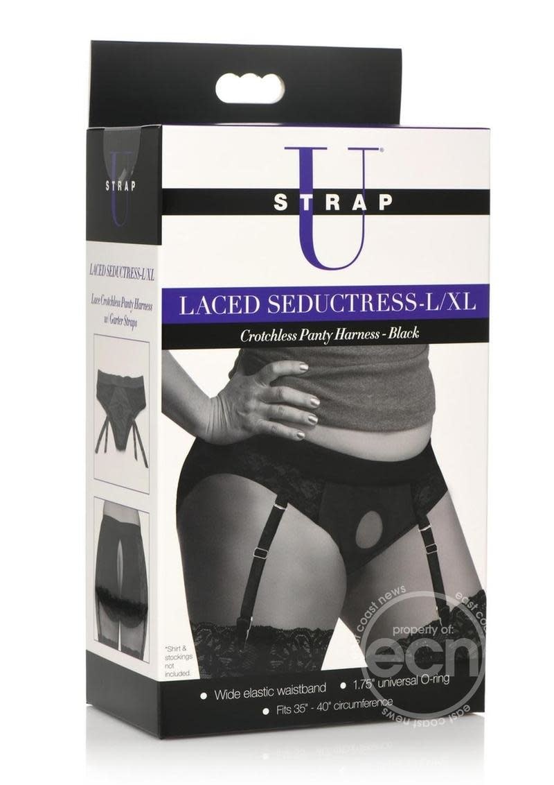 STRAP U LACED SEDUCTRESS LACE CROTCHLESS PANTY HARNESS WITH GARTER STRAPS