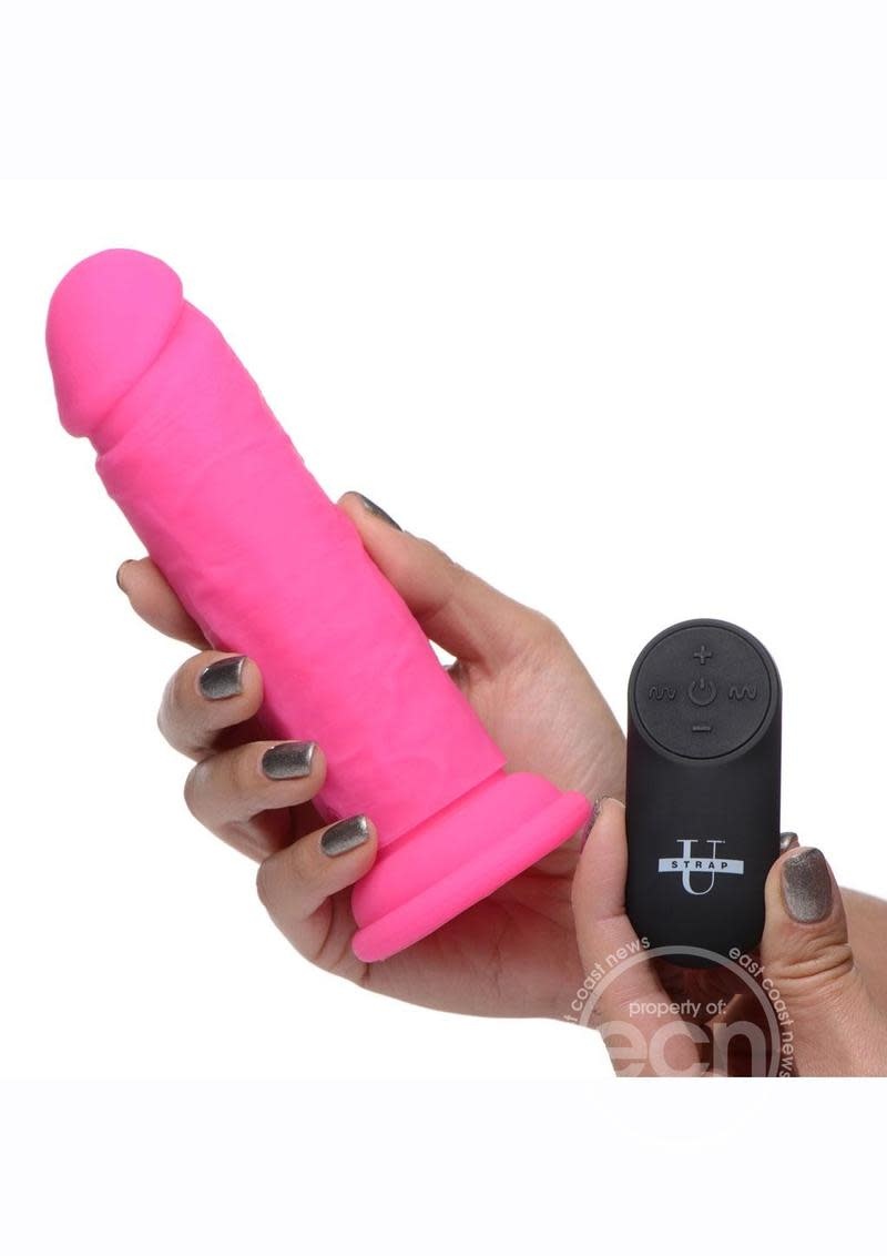 STRAP U POWER PLAYER 28X VIBRATING SILICONE RECHARGEABLE DILDO 6.5" WITH REMOTE PINK