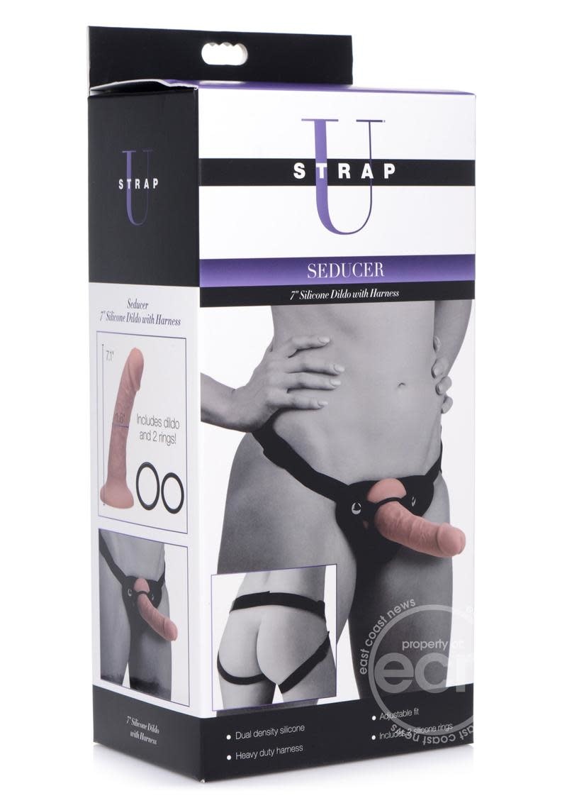 Seduce with confidence! This strap-on harness set includes a fully adjustable harness and a premium dual density dildo for a comfortable yet luxurious feel. The Seducer is ready to use as soon as the mood strikes – secure the realistic dong to the harness via the included silicone rings and get your strap on with some quick adjustments to the harness!This heavy duty harness is built for durability – ready to stand up to the most dynamic of thrusting and pumping you can dish out. Adjusts to most body sizes so everyone can strap up and get down! The two included silicone rings allow you to upgrade or downgrade in dildo size for new additions to your collection in the future or for suction cup dildos you may already own.The included dual density suction cup dildo is made with premium, phthalate free, body safe silicone for a worry free strapping session. Perfectly thick and long for peak pleasure in most holes, this dong is the goldilocks of suction cup dildos built for strap on use – dense, firm, yet flexible for comfort. The realistic veiny texture and defined head provides a genuine feel and pleasure anyone can enjoy.