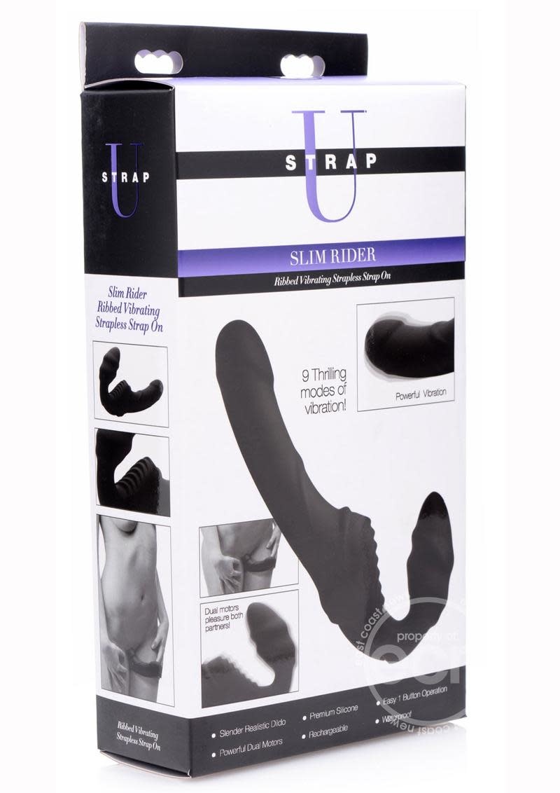 A slender shaft, subtle textures, and 9 incredible modes of vibration set this beautiful strapless strap-on apart! This rechargeable pleasure tool features dual motors to provide you with 3 speeds and 6 patterns of powerful internal thrumming. The single control button is easy-to-use and accessible during penetration. Both ends of this artfully designed double dildo are shaped for the ultimate in ecstasy: the bulb is adorned with gentle waves while you grind your clit against bold grooves of the front pad. Meanwhile your partner will be treated to a narrow, comfortable shaft with a slight ridge. It is even waterproof so that you can take your play into the shower, bath, pool, and more! Explore greater intimacy with a vibrating double-ended strapon dildo. Made of silky silicone, the Slim Rider is non-porous and phthalate-free. Clean with mild soap and warm water and avoid use with silicone lubricants.