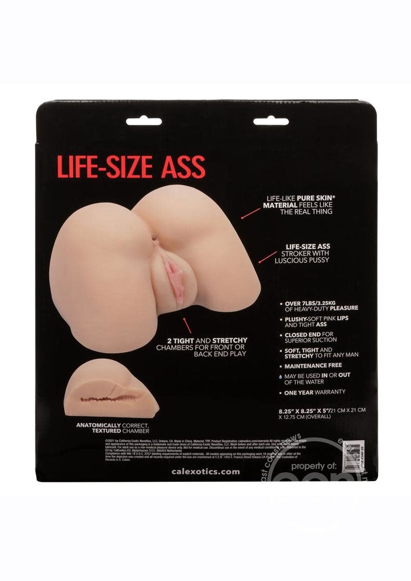 Over 7 lb. /3. 25 kg of heavy-duty stroking pleasure. Life-size ass stroker with luscious pussy. 2 tight and stretchy chambers for front or back end play. Ultra life-like Pure Skin® material. Anatomically correct, textured chamber. Plushy-soft pink lips and tight ass. Closed end for superior suction. Maintenance free.