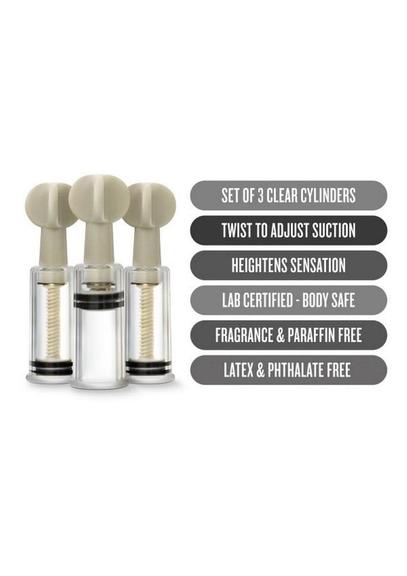 Temptasia Clit & Nipple Twist Suckers bring engorgement and heightened sensitivity to your most sensitive areas. Each pocket-sized suction cylinder in this triple set is fully adjustable. Place the cylinder over your clit or nipple, then twist the top to adjust. The more you twist, the more suction and sensitivity you create. Lube the opening of the cylinder for increased suction and comfort. Use one, two, or all three at the same time! Made of body safe acrylic, Temptasia Suckers are easy to use and easy to clean.