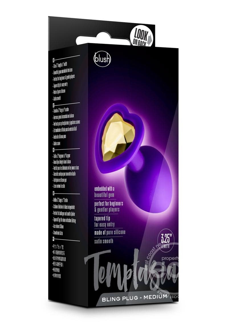 Your play just got pretty with this sweet Bling Plug! The Temptasia Bling Plug Medium features a beautifully designed heart-shaped base, embedded with a golden gemstone. This satiny silicone plug has a tapered tip for easy insertion. The tight neck offers gentle pressure and is ideal for extended wear. Or show your bling during your regular erotic play! For the best experience, use with your favorite quality water-based lubricant. Made of platinum cured silicone, Temptasia Bling Plugs are body safe and easy to clean.