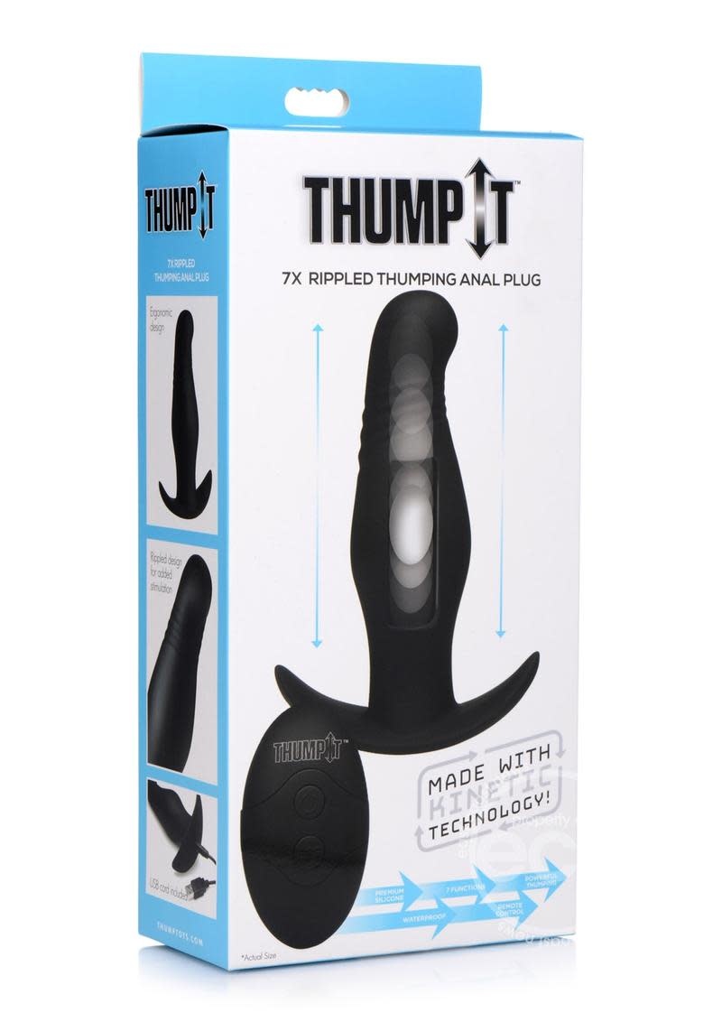 Featuring a smooth bulb, subtle ripples, and a curved tip, this bouncing booty plug delivers all-new anal delights. Prepare for deep, powerful sensations! The inner weight inside this plug uses Kinetic Technology to create an ultra-powerful thumping motion. Explore 7 functions, including 3 speeds and 4 patterns, of incredible up-and-down movement inside you anus! A remote control makes solo use more convenient, and partner use more exciting! Use it at home during chores, or even out on the town for a naughty date. Made of premium silicone, Thump-Its are non-porous and phthalate-free. Clean this waterproof and rechargeable pleasure tool with toy cleaner or a mild soap after use, and never use with silicone lubricants.