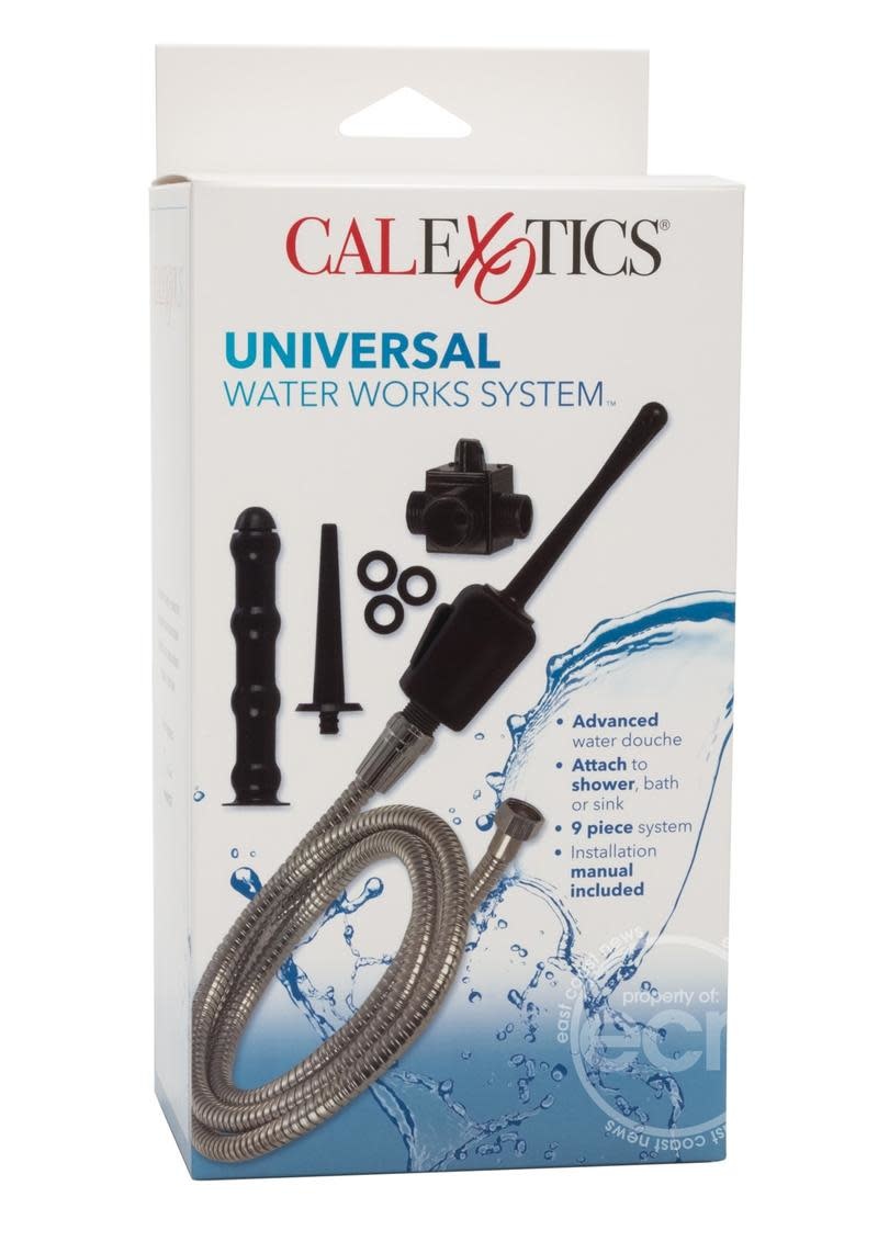 Multi-use system easily attaches to shower, bath, or sink! Versatile attachments make this the perfect bathroom accessory for intimate water play. Directional valve adapter installs easily to switch from shower head or faucet to the Universal Water Works System. Includes: Directional valve adapter, 3 variable spray attachments, hand-held on/off control, 6’/ 1.828 meters of non-tarnishing, nickel-free, non-crimping flexible hose, and spare washers. Instructions included.