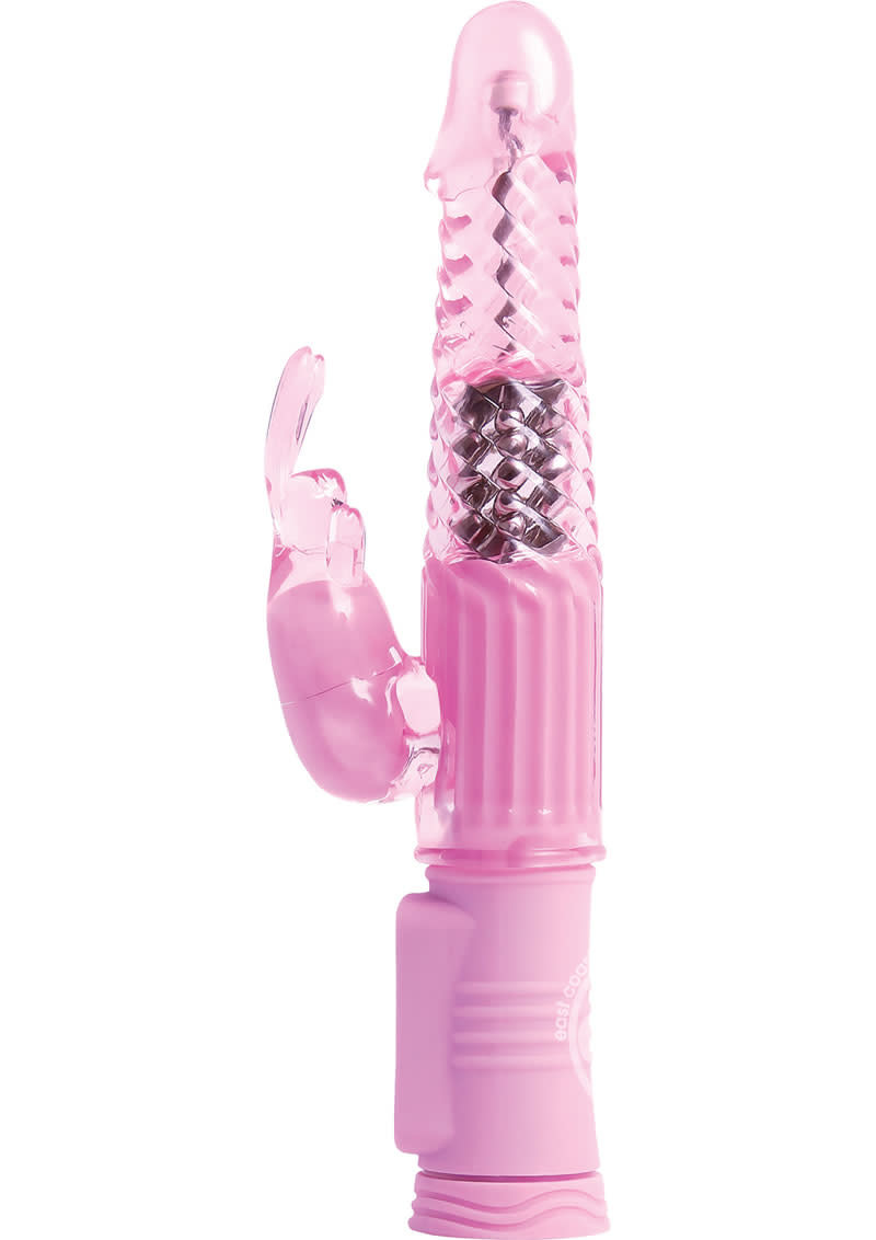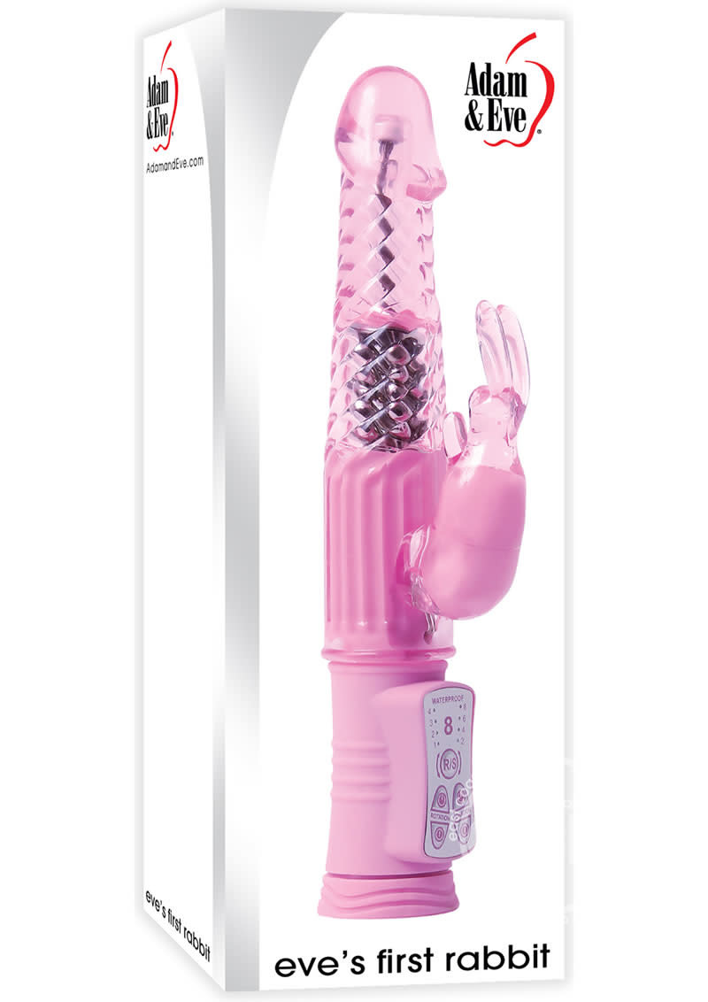 Adam and Eve Toys Eve's First Rabbit Pink Vibrator. New to the world of rabbit vibrators? Let Adam and Eve Toys has the perfect introduction! Eve's First Rabbit! Made of flexible, it boasts all the features of luxury rabbits from its, multiple duo-directional rotation settings, 4 shaft rotation speeds to its 8 clitoral vibration functions. Slimmer, sleeker size makes it perfect for beginners. First Rabbit Vibrator features: 9 inches total length, can safely be inserted 4.5 inches. Approximately 1.25 inches wide at the center of the shaft. 4 speed shaft rotation. Rotating g-spot tip with spinning beads. Multiple duo directional rotation settings. 8 vibration function clitoral bunny. Flicking bunny ears for extra stimulation. Made using phthalate free materials Thermoplastic Rubber TPR. Easy to use. User friendly control panel. Waterproof for play in and out of the water. Vibrating sex toy requires 4 AAA batteries, not included. Sold separately. Colors may vary. Weight .50.