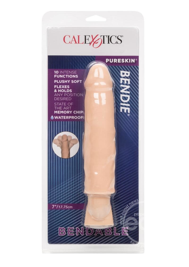 10-Function Pure Skin Bendies Vibrator is a life-like, plushy soft, unscented, maintenance free dual density dong. Pure Skin multi-function dong is quiet, flexing vertebrae allows bending in any direction. 10 sensational functions of vibration, pulsation, and escalation. Powerful motor positioned in the tip. Easy to operate push button control with state-of-the-art memory chip that resumes last function used. Automatic on/off button. Safe and pure for body and pleasure. Waterproof vibrations for play outside the bedroom. Made using phthalate free, non-toxic materials Thermoplastic Rubber TPR dong, ABS plastic control. Vibrating sex toy requires 3 AAA batteries, not included. Vibrating dong measures 7 inches long by 1.5 inches wide. Always clean before and after use plus between partners. To increase the life of all sex toys remove batteries prior to storage. 10-Function Pure Skin Bendies is a registered trademark for California Exotic Novelties. New images added Embrace Seduction California Exotic Novelties Web Image Library DVD.