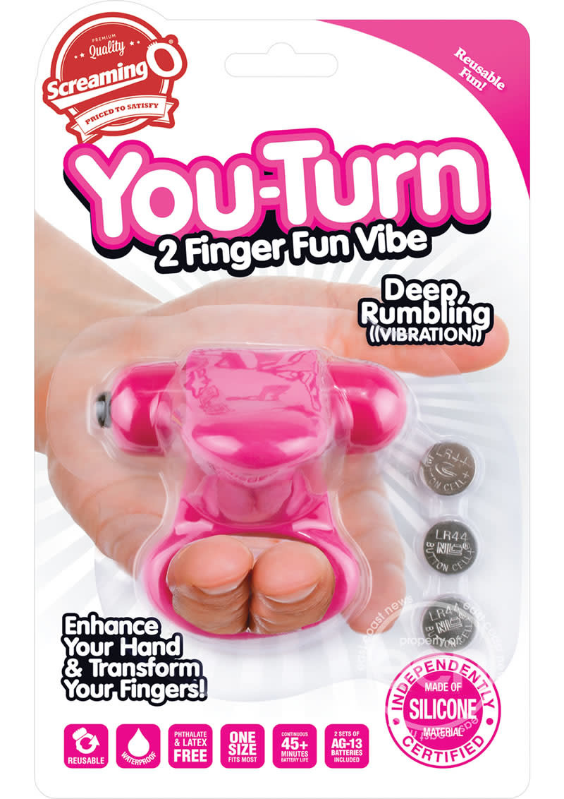 Screaming O You Turn Finger Fun Vibe Strawberry Pink. The You Turn finger fitted fun vibe enhances your hand and transforms your fingers with a unique design unlike anything on the market. Use the You Turn to boost the signature come hither G-spot massage motion with penetrating vibration and clitoral stimulation. Made of lab tested, body safe True Silicone, the You Turn fits securely and comfortably with an easy to use design. Simply slip two fingers through the loop and use your thumb to adjust the motors position to send powerful vibes throughout your hand for a memorable manual experience. The You Turn is powered by the famous Vooom Bullet, a new low pitch mini vibe that vibrates with a deep rumble, rather than a zingy buzz, with stimulation that travels into the hand and up to the fingertips. And for pleasure plus erection enhancement, stretch the loop around the penis with the motor on top and enjoy the You Turn as a vibrating cock ring! Features: enhance your hand for powerful stimulation. Deep, rumbling Vooom vibration. Curved clitoral stimulator. Made of lab tested, body safe True Silicone. Stretchy, comfortable finger loop. Single speed vibrator requires AG13 batteries. Latex free and phthalate free materials Silicone sleeve, ABS plastic bullet vibrator.