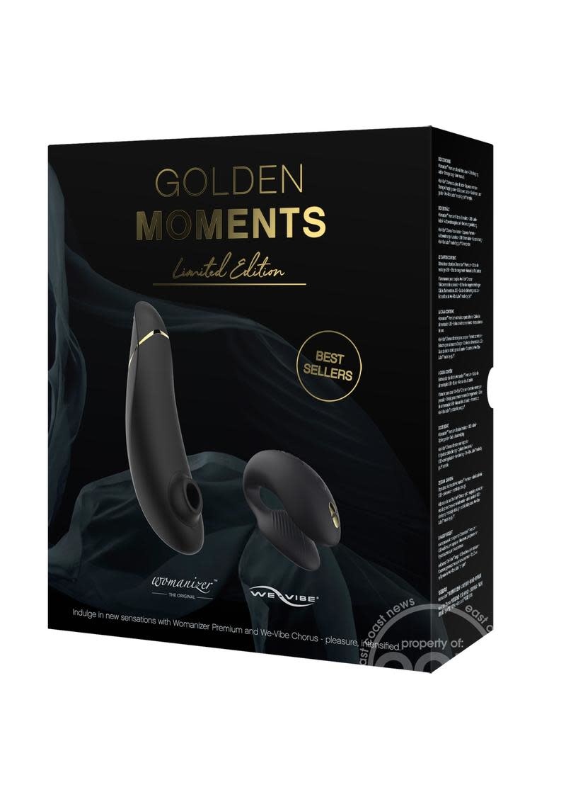 It's the best of both worlds. We-Vibe, the creators of the original and best-selling couples vibrator and Womanizer, the innovators of the patented Pleasure Air Technology, have come together to create an exclusive collection featuring each brand’s flagship products. The most intuitive couples vibrator by We-Vibe and the original Womanizer are now combined in one exclusive boxset. Created to celebrate the union of the two brands. The Golden Moments Collection features two WOW Tech flagship products: Womanizer Premium and We-Vibe Chorus, both designed in matte black with gold accents — exclusive to this collection. All product features remain the same as usual.