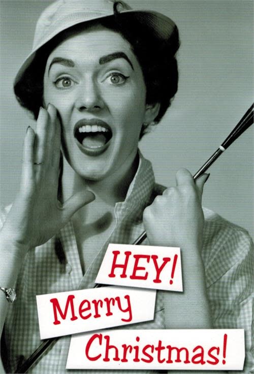 X MAS CARD WOMAN YELLING, HEY! MERRY CHRISTMAS!