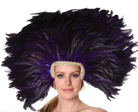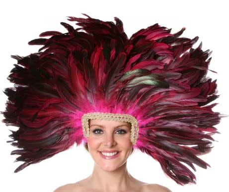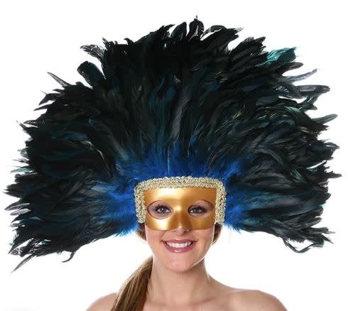 Dyed Feather Headdress with removeable Mask measures 13x22 inches and is handmade with 8-10 inch Dyed Half Bronze/Iridescent Rooster Coque Tail Feathers. Two rows of gold braided trim cover the edge the gold half face mask form that can easily be removed or re-attached. Black elastic straps keeps the headdress from falling forward with an extra strap fitted over the top of head.